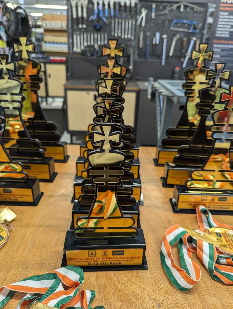 Chess Visionaries Tournamentsvedant_joshiOctober 30, 2024 Glimpse of Chess Visionaries International Academy's Tournament 2024 at Decathlon Trophies Winner Trophies